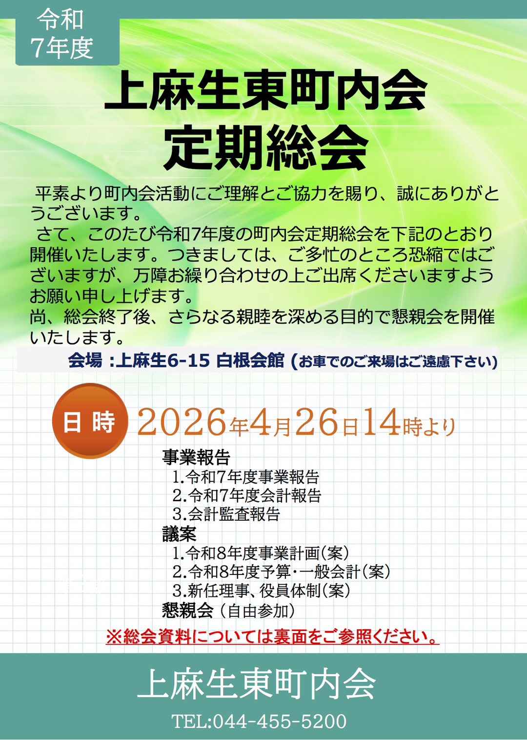 令和7年度定期総会 令和8年4月26日14時より開催します。