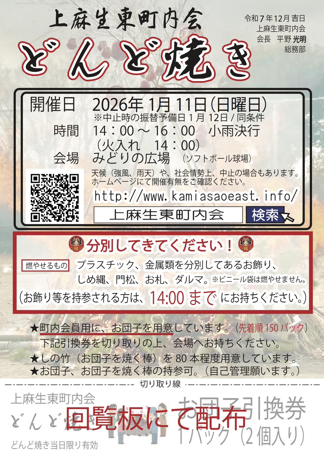 本日のどんど焼き火入れは強風が見込まれる為に明日12日へ順延いたします。
